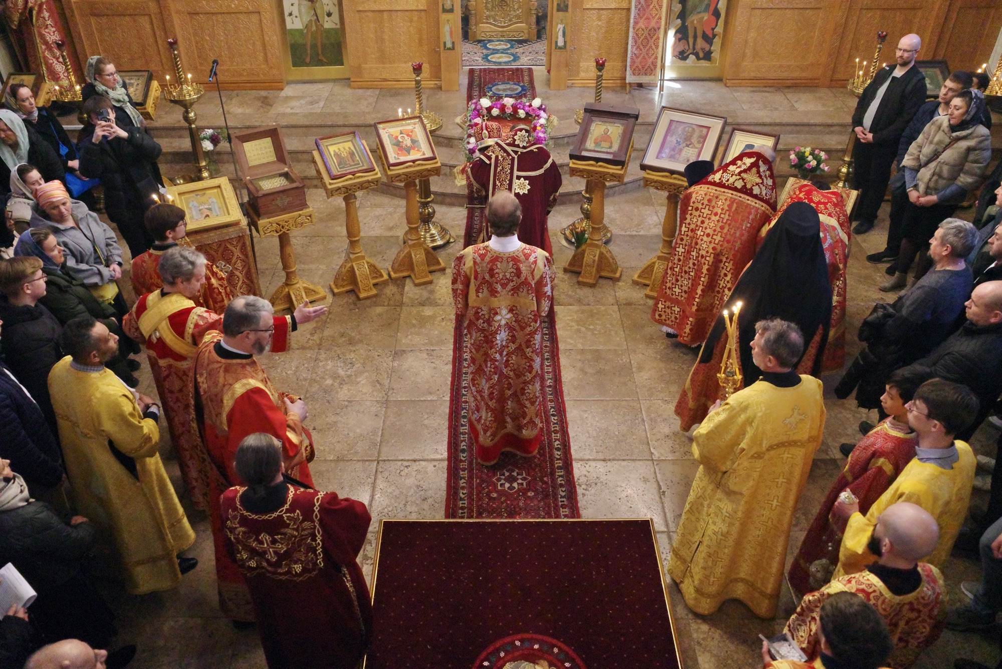 Собравшись въ центрѣ храма, предъ Крестомъ и Евангеліемъ, мощами и множествомъ святыхъ иконъ — въ память возстановленія иконъ, отъ какового историческаго событія и беретъ свое начало праздникъ Торжества Православія, — архипастырь и духовенство совершили особый «молебенъ о обращеніи заблудшихъ», въ который былъ включенъ самъ Чинъ Православія: провозглашеніе древней и неизменной Вѣры Церкви, исповѣданіе вѣрности и послушанія ученію святыхъ отцовъ, запечатлѣнному въ Соборахъ, а также ежегодное воспоминаніе тѣхъ, кто на протяженіи вѣковъ посвятилъ свою жизнь сохраненію проповѣди истинной Вѣры передъ лицомъ ересей, расколовъ и обновленчества — какъ въ прошломъ, такъ и въ настоящемъ.