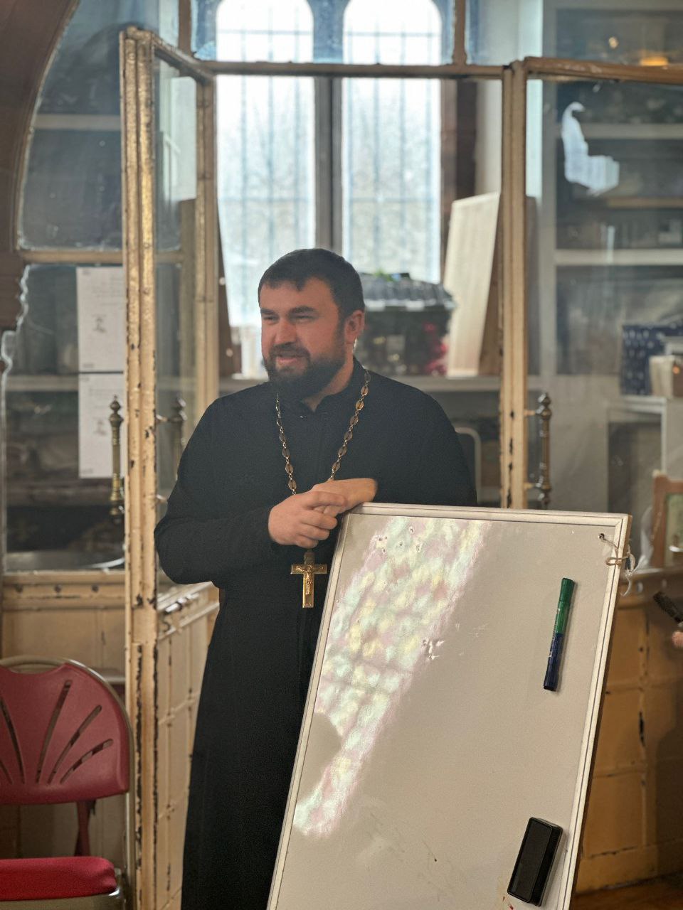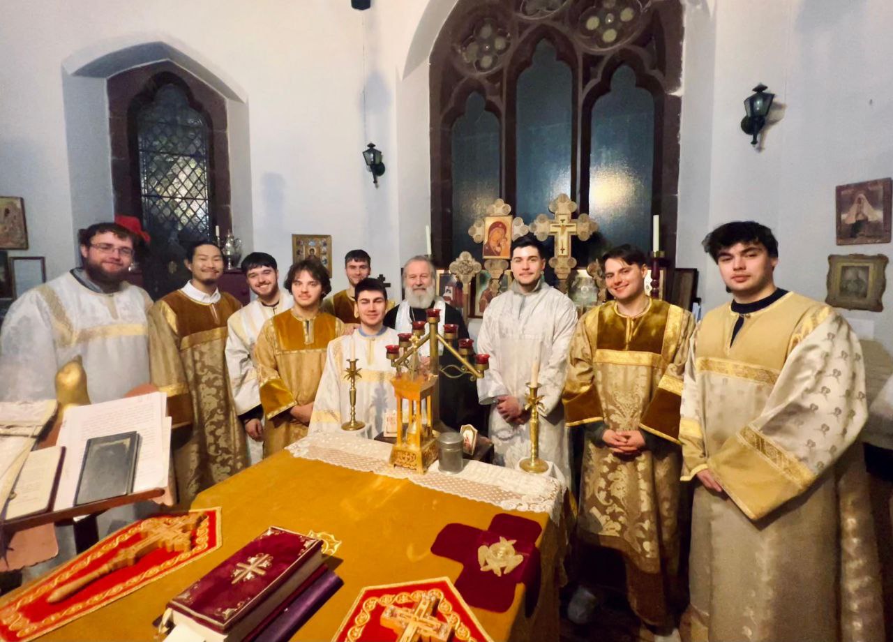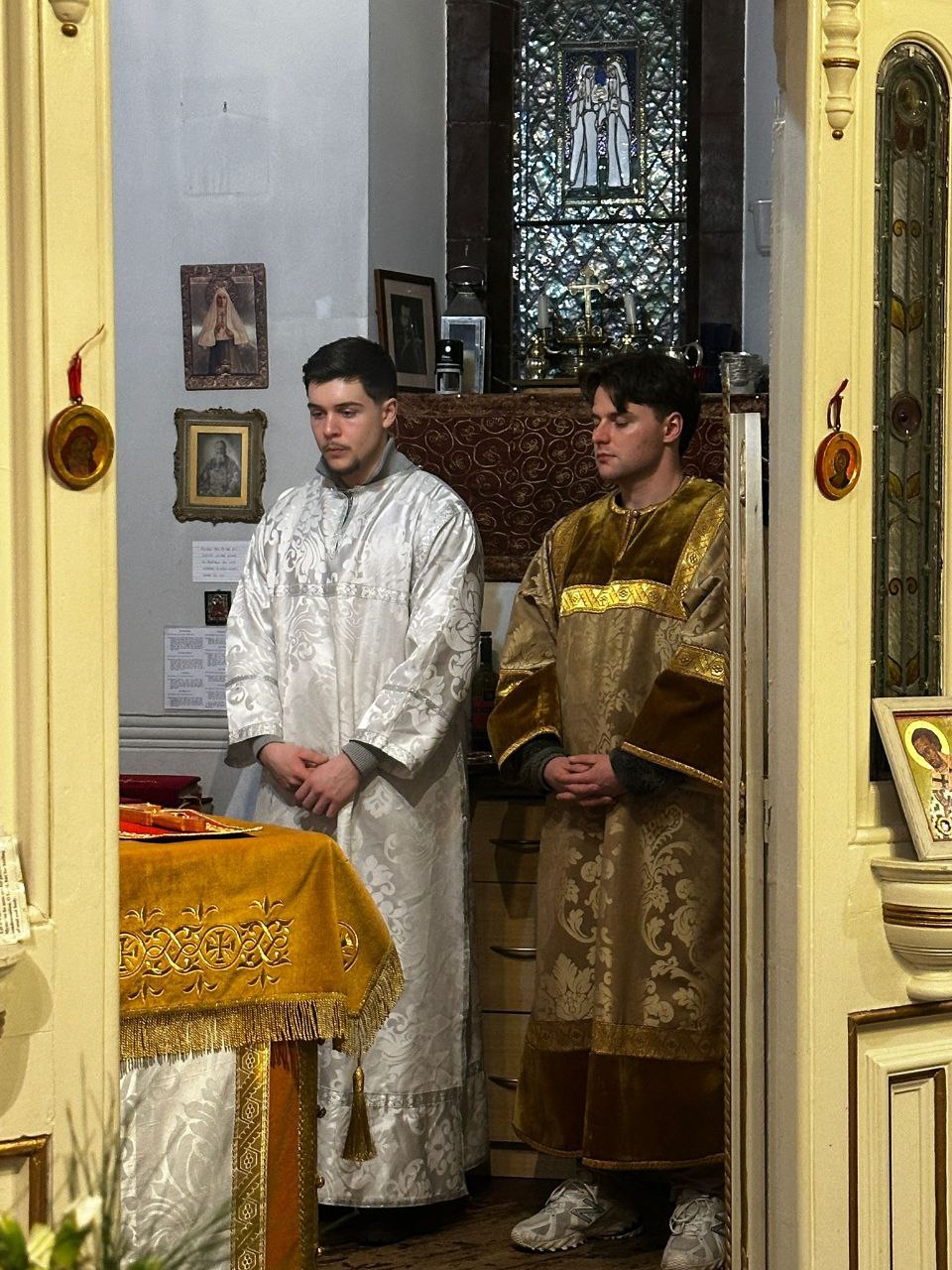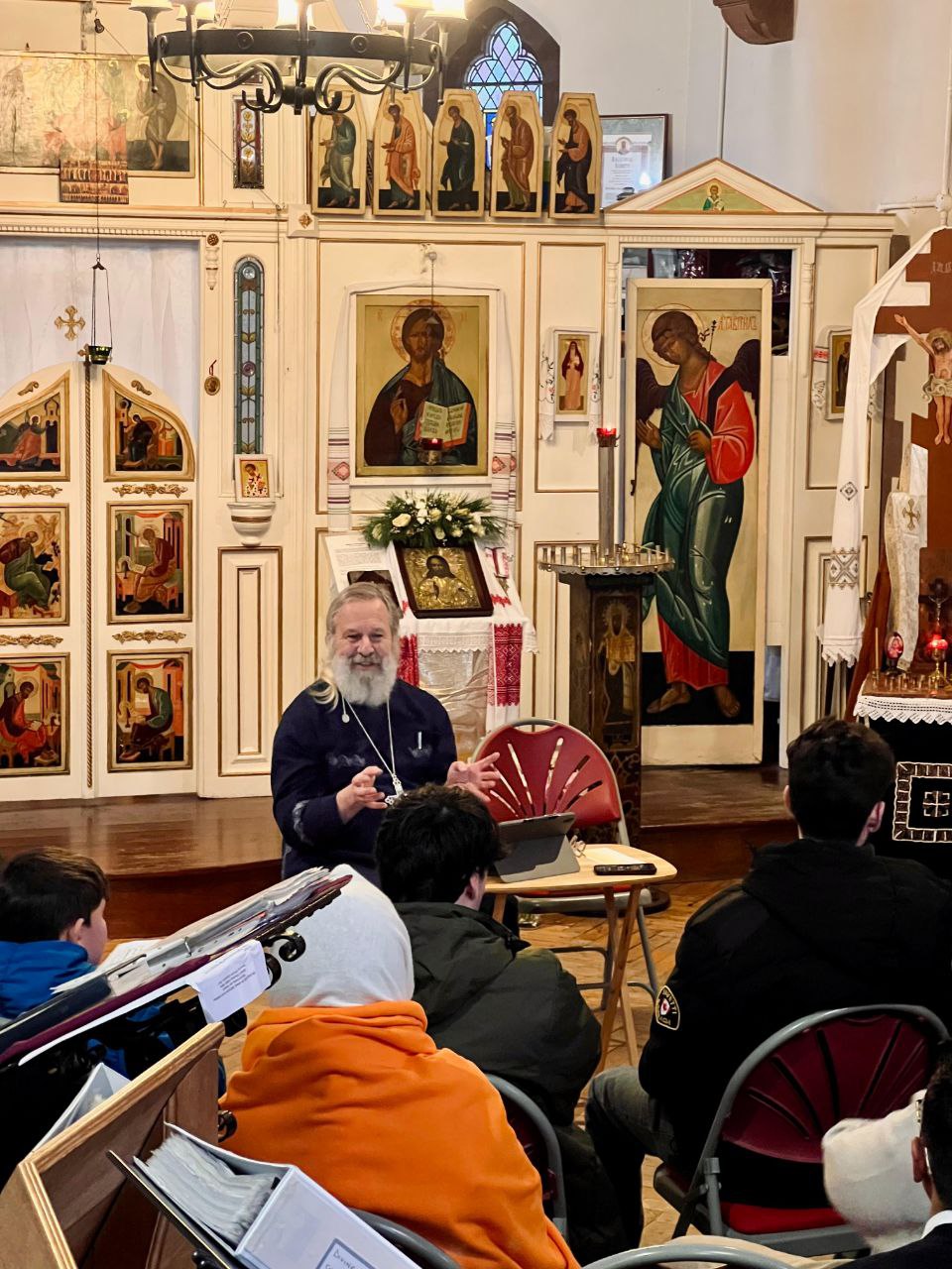 Молодые люди прибыли в Мерсисайд в пятницу 10 / 23 января и были тепло встречены священником Иустином Венном и чтецом Серафимом Уильямсом. Отец Иустин произнес первую беседу, посвященную иконографии; вторую беседу — о Лице Христа и о том, как мы призваны служить Ему, — провел настоятель прихода, протоиерей Павел Эллиотт. После этого была совершена вечерня, возглавленная отцом Павлом при участии добровольных прислужников и чтецов.